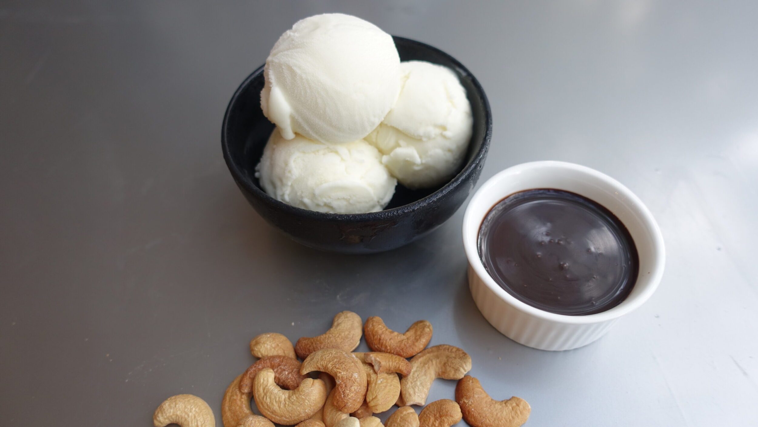 Classic Vanilla ice cream served with Chocolate Sauce and lots and lots of Roasted Cashew halves